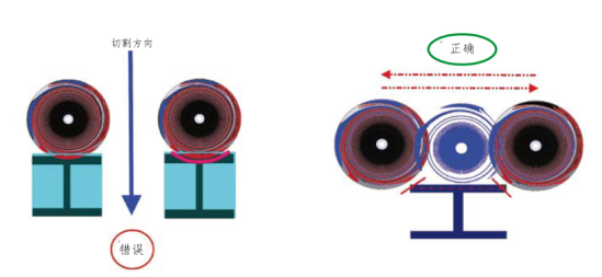 切割片必须在90度垂直情况下切割,并且要如下图所示,需前后移动切割,不能上下移动切割,这样是为了避免切割片和工件之间的接触面积较大导致过热情况出现,不利于散热。