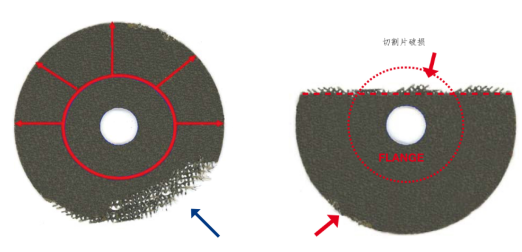 切割片切割工件时的切入深度不宜过深,否则将会导致切割片破损,中心环脱落!